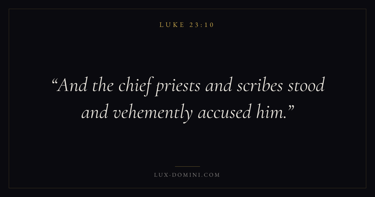 Books / Luke / Chapter 23 / Verse 10 ← Luke 23:9 Luke 23:10 Luke 23:11 → And the chief priests and scribes stood and vehemently accused him. Download verse card Share on Twitter Share on Facebook Pin it ✦ Key themes PrayerJustice and mercySalvationHumilitySpirit Read with Luke 23:8Luke 23:9Matthew 6:9Luke 18:1 Related topics Bible verses about prayerBible verses about justice and mercyBible verses about salvationBible verses about humility ✦ Luke Chapter 23 verses V. 1 V. 2 V. 3 V. 4 V. 5 V. 6 V. 7 V. 8 V. 9 V. 10 V. 11 V. 12 V. 13 V. 14 V. 15 V. 16 V. 17 V. 18 V. 19 V. 20 V. 21 V. 22 V. 23 V. 24 V. 25 V. 26 V. 27 V. 28 V. 29 V. 30 V. 31 V. 32 V. 33 V. 34 V. 35 V. 36 V. 37 V. 38 V. 39 V. 40 V. 41 V. 42 V. 43 V. 44 V. 45 V. 46 V. 47 V. 48 V. 49 V. 50 V. 51 V. 52 V. 53 V. 54 V. 55 V. 56