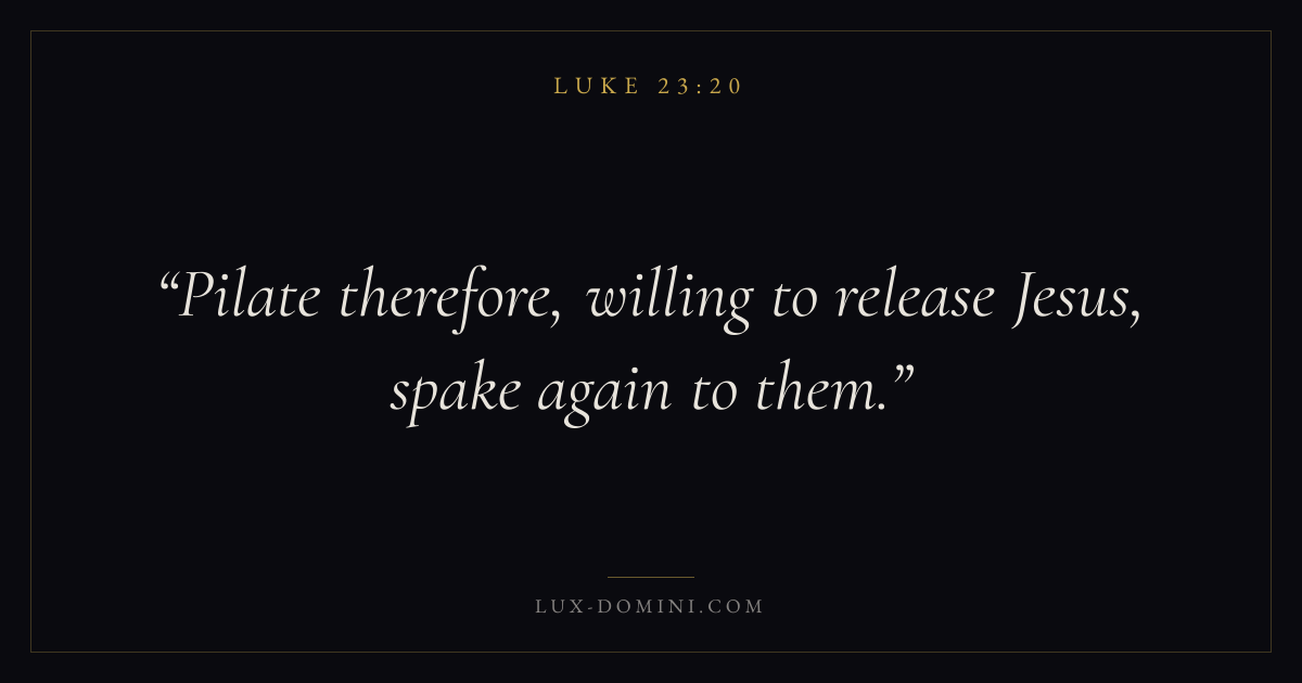 Books / Luke / Chapter 23 / Verse 20 ← Luke 23:19 Luke 23:20 Luke 23:21 → Pilate therefore, willing to release Jesus, spake again to them. Download verse card Share on Twitter Share on Facebook Pin it ✦ Key themes Anxiety and fearPrayerJustice and mercySalvationSpirit Read with Luke 23:17Luke 23:18Philippians 4:6Isaiah 41:10 Related topics Bible verses about anxiety and fearBible verses about prayerBible verses about justice and mercyBible verses about salvation ✦ Luke Chapter 23 verses V. 1 V. 2 V. 3 V. 4 V. 5 V. 6 V. 7 V. 8 V. 9 V. 10 V. 11 V. 12 V. 13 V. 14 V. 15 V. 16 V. 17 V. 18 V. 19 V. 20 V. 21 V. 22 V. 23 V. 24 V. 25 V. 26 V. 27 V. 28 V. 29 V. 30 V. 31 V. 32 V. 33 V. 34 V. 35 V. 36 V. 37 V. 38 V. 39 V. 40 V. 41 V. 42 V. 43 V. 44 V. 45 V. 46 V. 47 V. 48 V. 49 V. 50 V. 51 V. 52 V. 53 V. 54 V. 55 V. 56