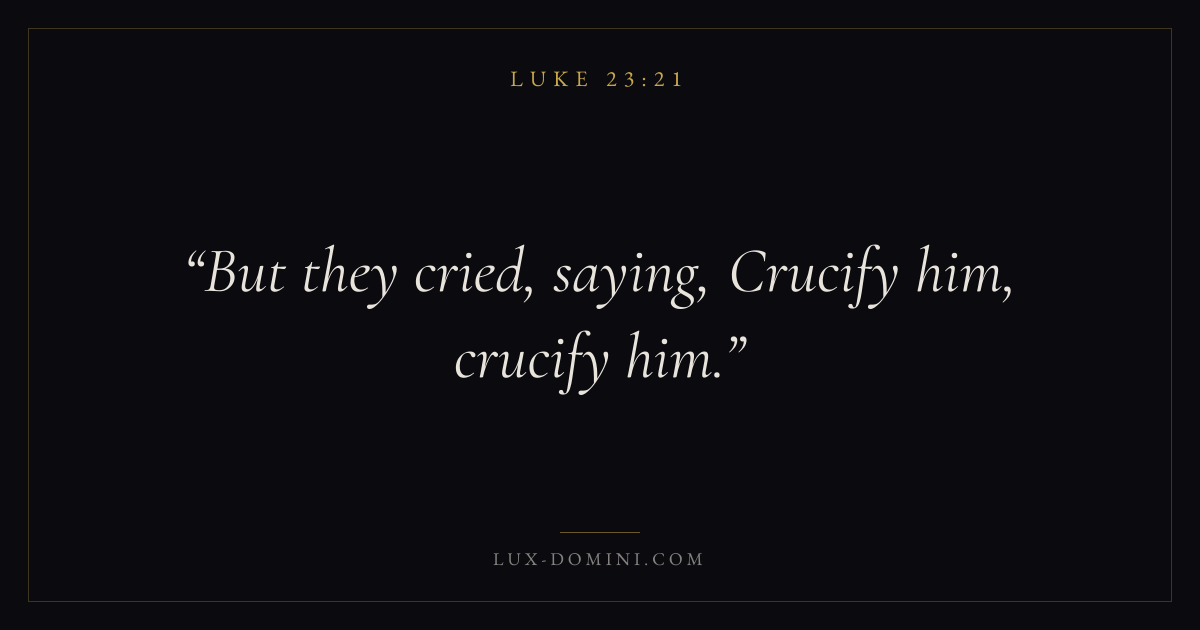 Books / Luke / Chapter 23 / Verse 21 ← Luke 23:20 Luke 23:21 Luke 23:22 → But they cried, saying, Crucify him, crucify him. Download verse card Share on Twitter Share on Facebook Pin it ✦ Key themes Anxiety and fearPrayerJustice and mercySalvationSpirit Read with Luke 23:17Luke 23:18Philippians 4:6Isaiah 41:10 Related topics Bible verses about anxiety and fearBible verses about prayerBible verses about justice and mercyBible verses about salvation ✦ Luke Chapter 23 verses V. 1 V. 2 V. 3 V. 4 V. 5 V. 6 V. 7 V. 8 V. 9 V. 10 V. 11 V. 12 V. 13 V. 14 V. 15 V. 16 V. 17 V. 18 V. 19 V. 20 V. 21 V. 22 V. 23 V. 24 V. 25 V. 26 V. 27 V. 28 V. 29 V. 30 V. 31 V. 32 V. 33 V. 34 V. 35 V. 36 V. 37 V. 38 V. 39 V. 40 V. 41 V. 42 V. 43 V. 44 V. 45 V. 46 V. 47 V. 48 V. 49 V. 50 V. 51 V. 52 V. 53 V. 54 V. 55 V. 56