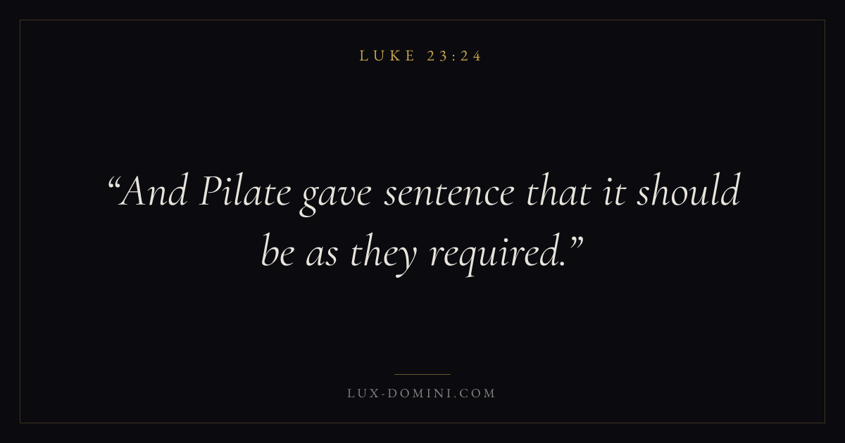Books / Luke / Chapter 23 / Verse 24 ← Luke 23:23 Luke 23:24 Luke 23:25 → And Pilate gave sentence that it should be as they required. Download verse card Share on Twitter Share on Facebook Pin it ✦ Key themes Anxiety and fearPrayerJustice and mercySalvationSpirit Read with Luke 23:22Luke 23:23Philippians 4:6Isaiah 41:10 Related topics Bible verses about anxiety and fearBible verses about prayerBible verses about justice and mercyBible verses about salvation ✦ Luke Chapter 23 verses V. 1 V. 2 V. 3 V. 4 V. 5 V. 6 V. 7 V. 8 V. 9 V. 10 V. 11 V. 12 V. 13 V. 14 V. 15 V. 16 V. 17 V. 18 V. 19 V. 20 V. 21 V. 22 V. 23 V. 24 V. 25 V. 26 V. 27 V. 28 V. 29 V. 30 V. 31 V. 32 V. 33 V. 34 V. 35 V. 36 V. 37 V. 38 V. 39 V. 40 V. 41 V. 42 V. 43 V. 44 V. 45 V. 46 V. 47 V. 48 V. 49 V. 50 V. 51 V. 52 V. 53 V. 54 V. 55 V. 56
