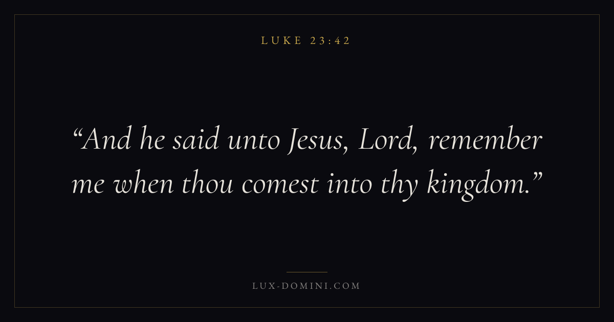 Books / Luke / Chapter 23 / Verse 42 ← Luke 23:41 Luke 23:42 Luke 23:43 → And he said unto Jesus, Lord, remember me when thou comest into thy kingdom. Download verse card Share on Twitter Share on Facebook Pin it ✦ Key themes PrayerJustice and mercyForgivenessSalvationSpirit Read with Luke 23:39Luke 23:40Matthew 6:9Luke 18:1 Related topics Bible verses about prayerBible verses about justice and mercyBible verses about forgivenessBible verses about salvation ✦ Luke Chapter 23 verses V. 1 V. 2 V. 3 V. 4 V. 5 V. 6 V. 7 V. 8 V. 9 V. 10 V. 11 V. 12 V. 13 V. 14 V. 15 V. 16 V. 17 V. 18 V. 19 V. 20 V. 21 V. 22 V. 23 V. 24 V. 25 V. 26 V. 27 V. 28 V. 29 V. 30 V. 31 V. 32 V. 33 V. 34 V. 35 V. 36 V. 37 V. 38 V. 39 V. 40 V. 41 V. 42 V. 43 V. 44 V. 45 V. 46 V. 47 V. 48 V. 49 V. 50 V. 51 V. 52 V. 53 V. 54 V. 55 V. 56