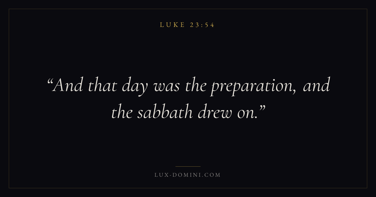 Books / Luke / Chapter 23 / Verse 54 ← Luke 23:53 Luke 23:54 Luke 23:55 → And that day was the preparation, and the sabbath drew on. Download verse card Share on Twitter Share on Facebook Pin it ✦ Key themes PrayerJustice and mercySalvationSpirit Read with Luke 23:52Luke 23:53Matthew 6:9Luke 18:1 Related topics Bible verses about prayerBible verses about justice and mercyBible verses about salvation ✦ Luke Chapter 23 verses V. 1 V. 2 V. 3 V. 4 V. 5 V. 6 V. 7 V. 8 V. 9 V. 10 V. 11 V. 12 V. 13 V. 14 V. 15 V. 16 V. 17 V. 18 V. 19 V. 20 V. 21 V. 22 V. 23 V. 24 V. 25 V. 26 V. 27 V. 28 V. 29 V. 30 V. 31 V. 32 V. 33 V. 34 V. 35 V. 36 V. 37 V. 38 V. 39 V. 40 V. 41 V. 42 V. 43 V. 44 V. 45 V. 46 V. 47 V. 48 V. 49 V. 50 V. 51 V. 52 V. 53 V. 54 V. 55 V. 56