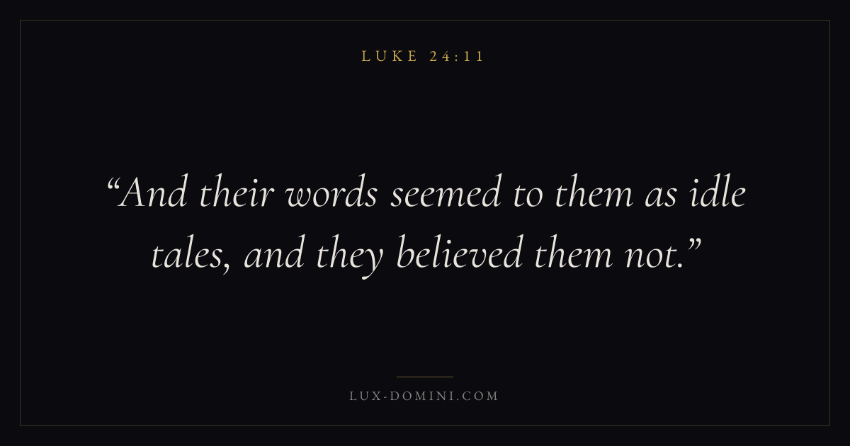 Books / Luke / Chapter 24 / Verse 11 ← Luke 24:10 Luke 24:11 Luke 24:12 → And their words seemed to them as idle tales, and they believed them not. Download verse card Share on Twitter Share on Facebook Pin it ✦ Key themes PrayerJustice and mercySalvationSpirit Read with Luke 24:10Luke 24:12Matthew 6:9Luke 18:1 Related topics Bible verses about prayerBible verses about justice and mercyBible verses about salvation ✦ Luke Chapter 24 verses V. 1 V. 2 V. 3 V. 4 V. 5 V. 6 V. 7 V. 8 V. 9 V. 10 V. 11 V. 12 V. 13 V. 14 V. 15 V. 16 V. 17 V. 18 V. 19 V. 20 V. 21 V. 22 V. 23 V. 24 V. 25 V. 26 V. 27 V. 28 V. 29 V. 30 V. 31 V. 32 V. 33 V. 34 V. 35 V. 36 V. 37 V. 38 V. 39 V. 40 V. 41 V. 42 V. 43 V. 44 V. 45 V. 46 V. 47 V. 48 V. 49 V. 50 V. 51 V. 52 V. 53
