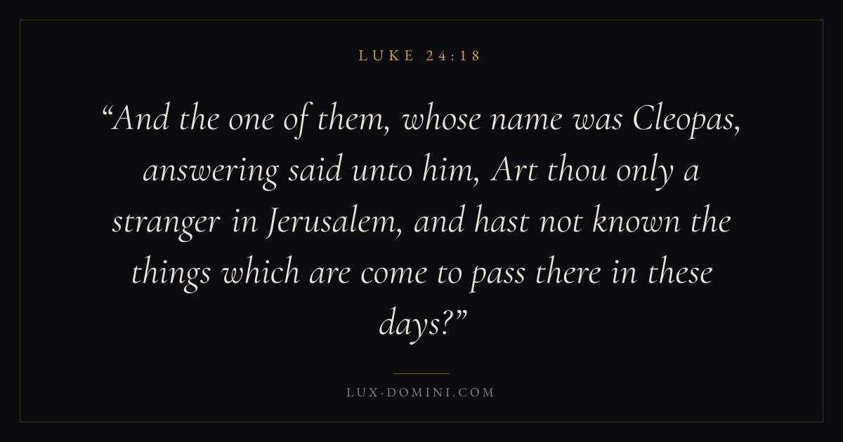 And the one of them, whose name was Cleopas, answering said unto him, Art thou only a stranger in Jerusalem, and hast not known the things which are come to pass there in these days?