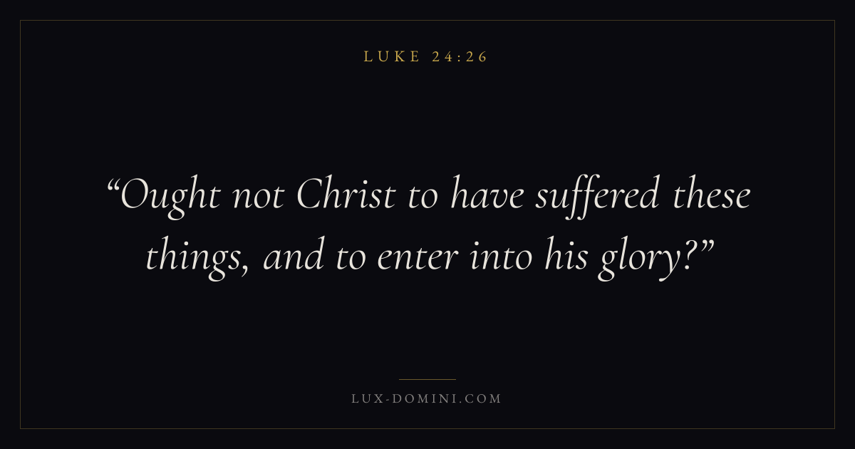 Books / Luke / Chapter 24 / Verse 26 ← Luke 24:25 Luke 24:26 Luke 24:27 → Ought not Christ to have suffered these things, and to enter into his glory? Download verse card Share on Twitter Share on Facebook Pin it ✦ Key themes PrayerWisdomJustice and mercySalvationSpirit Read with Luke 24:22Luke 24:23Matthew 6:9Luke 18:1 Related topics Bible verses about prayerBible verses about wisdomBible verses about justice and mercyBible verses about salvation ✦ Luke Chapter 24 verses V. 1 V. 2 V. 3 V. 4 V. 5 V. 6 V. 7 V. 8 V. 9 V. 10 V. 11 V. 12 V. 13 V. 14 V. 15 V. 16 V. 17 V. 18 V. 19 V. 20 V. 21 V. 22 V. 23 V. 24 V. 25 V. 26 V. 27 V. 28 V. 29 V. 30 V. 31 V. 32 V. 33 V. 34 V. 35 V. 36 V. 37 V. 38 V. 39 V. 40 V. 41 V. 42 V. 43 V. 44 V. 45 V. 46 V. 47 V. 48 V. 49 V. 50 V. 51 V. 52 V. 53