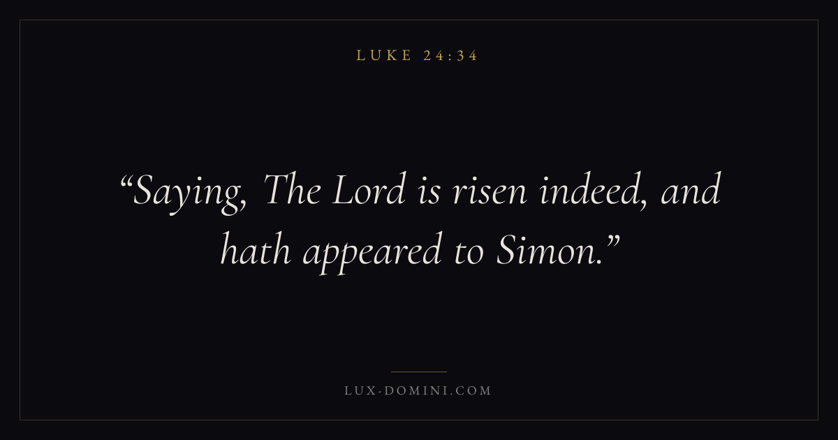 Books / Luke / Chapter 24 / Verse 34 ← Luke 24:33 Luke 24:34 Luke 24:35 → Saying, The Lord is risen indeed, and hath appeared to Simon. Download verse card Share on Twitter Share on Facebook Pin it ✦ Key themes PrayerJustice and mercySalvationSpirit Read with Luke 24:32Luke 24:33Matthew 6:9Luke 18:1 Related topics Bible verses about prayerBible verses about justice and mercyBible verses about salvation ✦ Luke Chapter 24 verses V. 1 V. 2 V. 3 V. 4 V. 5 V. 6 V. 7 V. 8 V. 9 V. 10 V. 11 V. 12 V. 13 V. 14 V. 15 V. 16 V. 17 V. 18 V. 19 V. 20 V. 21 V. 22 V. 23 V. 24 V. 25 V. 26 V. 27 V. 28 V. 29 V. 30 V. 31 V. 32 V. 33 V. 34 V. 35 V. 36 V. 37 V. 38 V. 39 V. 40 V. 41 V. 42 V. 43 V. 44 V. 45 V. 46 V. 47 V. 48 V. 49 V. 50 V. 51 V. 52 V. 53
