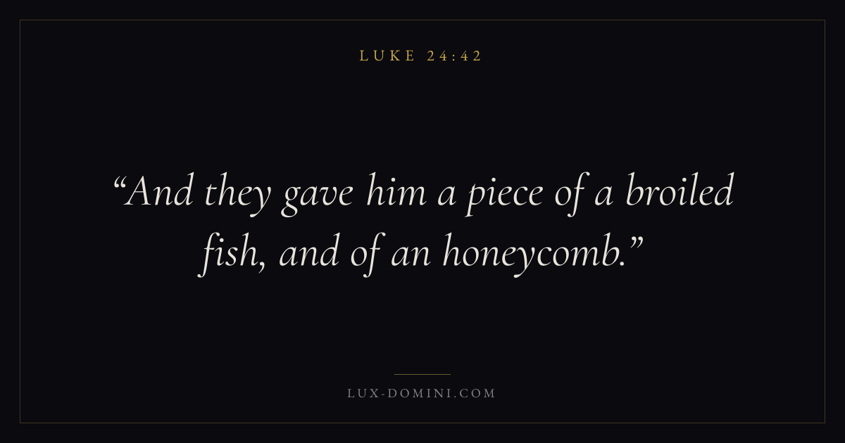 Books / Luke / Chapter 24 / Verse 42 ← Luke 24:41 Luke 24:42 Luke 24:43 → And they gave him a piece of a broiled fish, and of an honeycomb. Download verse card Share on Twitter Share on Facebook Pin it ✦ Key themes PrayerJustice and mercySalvationPeaceSpirit Read with Luke 24:39Luke 24:40Matthew 6:9Luke 18:1 Related topics Bible verses about prayerBible verses about justice and mercyBible verses about salvationBible verses about peace ✦ Luke Chapter 24 verses V. 1 V. 2 V. 3 V. 4 V. 5 V. 6 V. 7 V. 8 V. 9 V. 10 V. 11 V. 12 V. 13 V. 14 V. 15 V. 16 V. 17 V. 18 V. 19 V. 20 V. 21 V. 22 V. 23 V. 24 V. 25 V. 26 V. 27 V. 28 V. 29 V. 30 V. 31 V. 32 V. 33 V. 34 V. 35 V. 36 V. 37 V. 38 V. 39 V. 40 V. 41 V. 42 V. 43 V. 44 V. 45 V. 46 V. 47 V. 48 V. 49 V. 50 V. 51 V. 52 V. 53