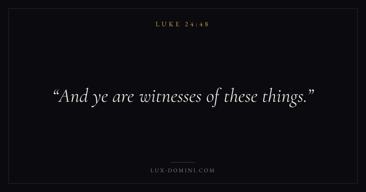 Books / Luke / Chapter 24 / Verse 48 ← Luke 24:47 Luke 24:48 Luke 24:49 → And ye are witnesses of these things. Download verse card Share on Twitter Share on Facebook Pin it ✦ Key themes PrayerJustice and mercySalvationPeaceSpirit Read with Luke 24:44Luke 24:45Matthew 6:9Luke 18:1 Related topics Bible verses about prayerBible verses about justice and mercyBible verses about salvationBible verses about peace ✦ Luke Chapter 24 verses V. 1 V. 2 V. 3 V. 4 V. 5 V. 6 V. 7 V. 8 V. 9 V. 10 V. 11 V. 12 V. 13 V. 14 V. 15 V. 16 V. 17 V. 18 V. 19 V. 20 V. 21 V. 22 V. 23 V. 24 V. 25 V. 26 V. 27 V. 28 V. 29 V. 30 V. 31 V. 32 V. 33 V. 34 V. 35 V. 36 V. 37 V. 38 V. 39 V. 40 V. 41 V. 42 V. 43 V. 44 V. 45 V. 46 V. 47 V. 48 V. 49 V. 50 V. 51 V. 52 V. 53