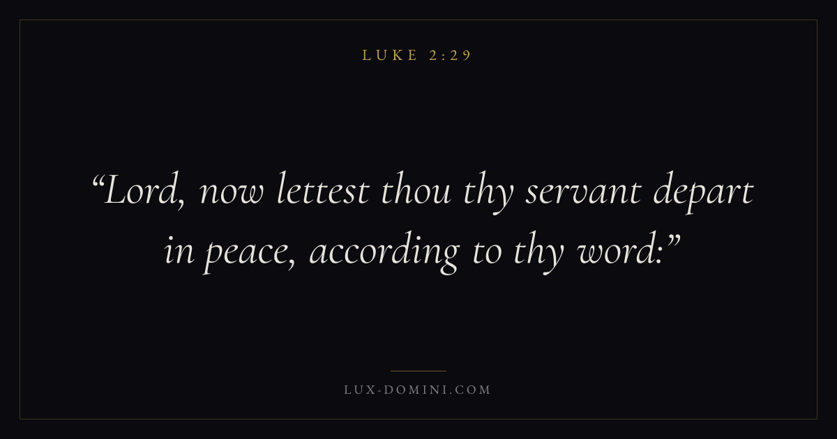 Books / Luke / Chapter 2 / Verse 29 ← Luke 2:28 Luke 2:29 Luke 2:30 → Lord, now lettest thou thy servant depart in peace, according to thy word: Download verse card Share on Twitter Share on Facebook Pin it ✦ Key themes HopePrayerJustice and mercySalvationSpirit Read with Luke 2:27Luke 2:28Romans 8:24Revelation 21:4 Related topics Bible verses about hopeBible verses about prayerBible verses about justice and mercyBible verses about salvation ✦ Luke Chapter 2 verses V. 1 V. 2 V. 3 V. 4 V. 5 V. 6 V. 7 V. 8 V. 9 V. 10 V. 11 V. 12 V. 13 V. 14 V. 15 V. 16 V. 17 V. 18 V. 19 V. 20 V. 21 V. 22 V. 23 V. 24 V. 25 V. 26 V. 27 V. 28 V. 29 V. 30 V. 31 V. 32 V. 33 V. 34 V. 35 V. 36 V. 37 V. 38 V. 39 V. 40 V. 41 V. 42 V. 43 V. 44 V. 45 V. 46 V. 47 V. 48 V. 49 V. 50 V. 51 V. 52