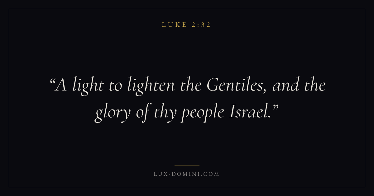 Books / Luke / Chapter 2 / Verse 32 ← Luke 2:31 Luke 2:32 Luke 2:33 → A light to lighten the Gentiles, and the glory of thy people Israel. Download verse card Share on Twitter Share on Facebook Pin it ✦ Key themes HopePrayerJustice and mercySalvationSpirit Read with Luke 2:33Luke 2:34Romans 8:24Revelation 21:4 Related topics Bible verses about hopeBible verses about prayerBible verses about justice and mercyBible verses about salvation ✦ Luke Chapter 2 verses V. 1 V. 2 V. 3 V. 4 V. 5 V. 6 V. 7 V. 8 V. 9 V. 10 V. 11 V. 12 V. 13 V. 14 V. 15 V. 16 V. 17 V. 18 V. 19 V. 20 V. 21 V. 22 V. 23 V. 24 V. 25 V. 26 V. 27 V. 28 V. 29 V. 30 V. 31 V. 32 V. 33 V. 34 V. 35 V. 36 V. 37 V. 38 V. 39 V. 40 V. 41 V. 42 V. 43 V. 44 V. 45 V. 46 V. 47 V. 48 V. 49 V. 50 V. 51 V. 52