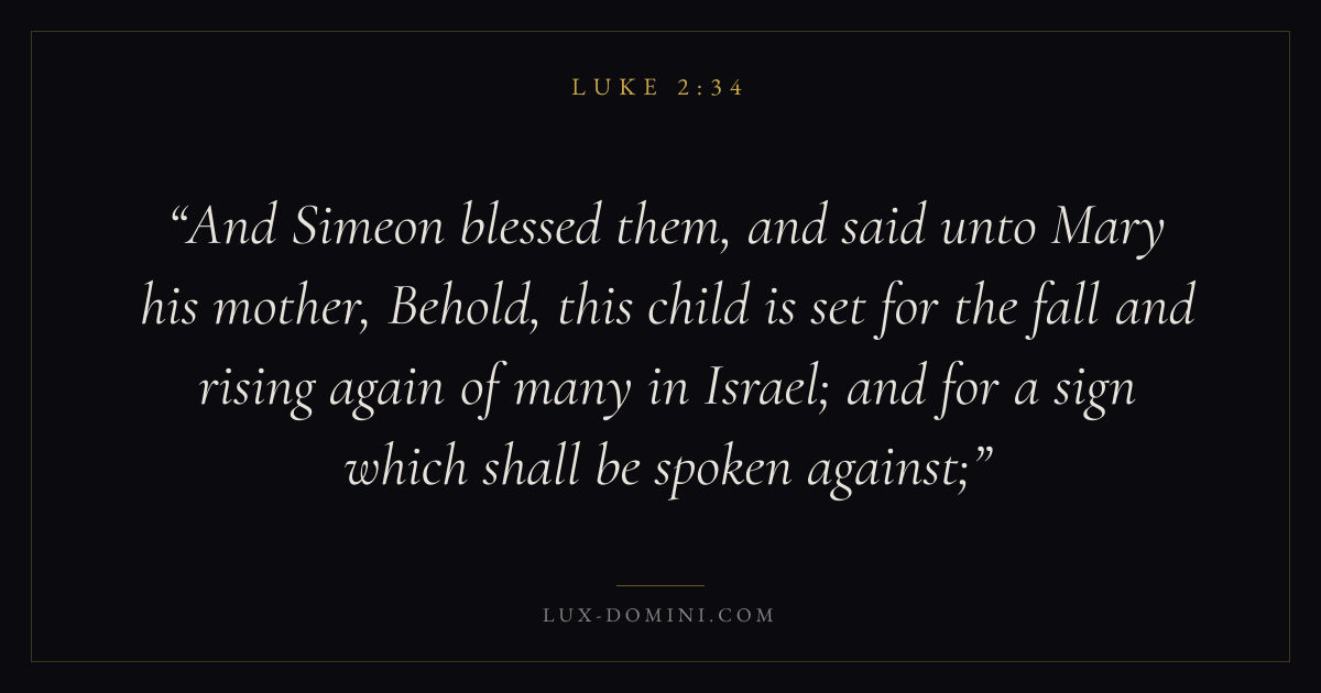 And Simeon blessed them, and said unto Mary his mother, Behold, this child is set for the fall and rising again of many in Israel; and for a sign which shall be spoken against;