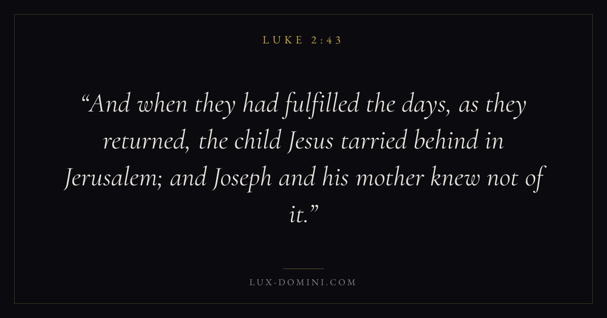 And when they had fulfilled the days, as they returned, the child Jesus tarried behind in Jerusalem; and Joseph and his mother knew not of it.