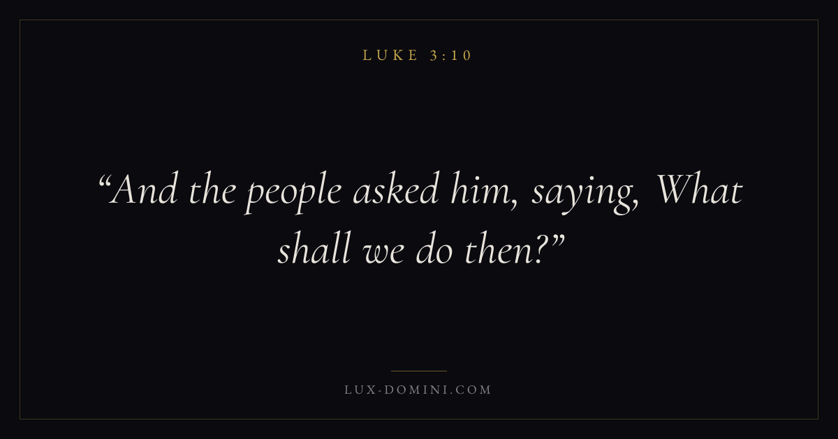 Books / Luke / Chapter 3 / Verse 10 ← Luke 3:9 Luke 3:10 Luke 3:11 → And the people asked him, saying, What shall we do then? Download verse card Share on Twitter Share on Facebook Pin it ✦ Key themes PrayerJustice and mercySalvationSpirit Read with Luke 3:8Luke 3:9Matthew 6:9Luke 18:1 Related topics Bible verses about prayerBible verses about justice and mercyBible verses about salvation ✦ Luke Chapter 3 verses V. 1 V. 2 V. 3 V. 4 V. 5 V. 6 V. 7 V. 8 V. 9 V. 10 V. 11 V. 12 V. 13 V. 14 V. 15 V. 16 V. 17 V. 18 V. 19 V. 20 V. 21 V. 22 V. 23 V. 24 V. 25 V. 26 V. 27 V. 28 V. 29 V. 30 V. 31 V. 32 V. 33 V. 34 V. 35 V. 36 V. 37 V. 38