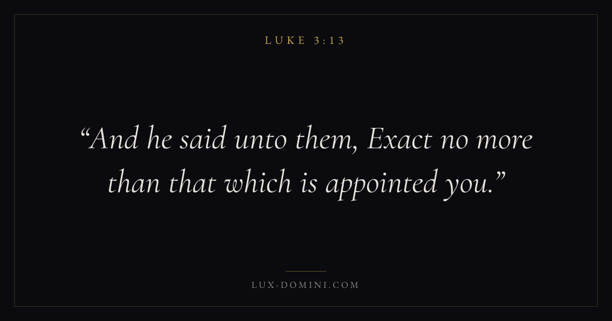 Books / Luke / Chapter 3 / Verse 13 ← Luke 3:12 Luke 3:13 Luke 3:14 → And he said unto them, Exact no more than that which is appointed you. Download verse card Share on Twitter Share on Facebook Pin it ✦ Key themes PrayerJustice and mercySalvationSpirit Read with Luke 3:11Luke 3:12Matthew 6:9Luke 18:1 Related topics Bible verses about prayerBible verses about justice and mercyBible verses about salvation ✦ Luke Chapter 3 verses V. 1 V. 2 V. 3 V. 4 V. 5 V. 6 V. 7 V. 8 V. 9 V. 10 V. 11 V. 12 V. 13 V. 14 V. 15 V. 16 V. 17 V. 18 V. 19 V. 20 V. 21 V. 22 V. 23 V. 24 V. 25 V. 26 V. 27 V. 28 V. 29 V. 30 V. 31 V. 32 V. 33 V. 34 V. 35 V. 36 V. 37 V. 38