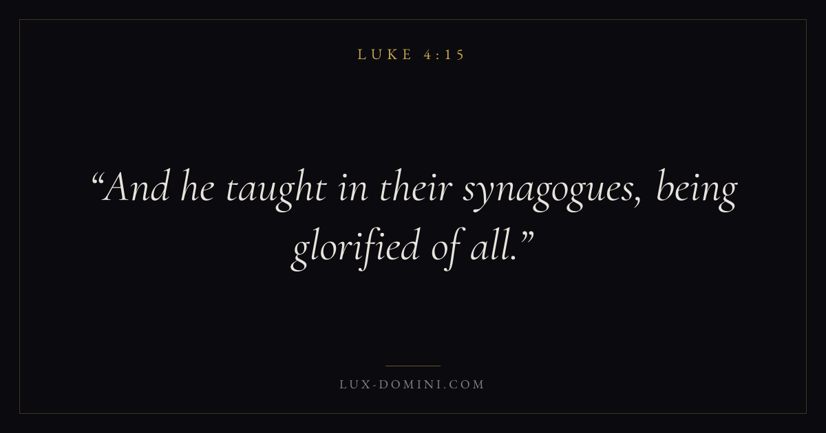Books / Luke / Chapter 4 / Verse 15 ← Luke 4:14 Luke 4:15 Luke 4:16 → And he taught in their synagogues, being glorified of all. Download verse card Share on Twitter Share on Facebook Pin it ✦ Key themes PrayerJustice and mercySalvationTruthSpirit Read with Luke 4:14Matthew 6:9Luke 18:1Micah 6:8 Related topics Bible verses about prayerBible verses about justice and mercyBible verses about salvationBible verses about truth ✦ Luke Chapter 4 verses V. 1 V. 2 V. 3 V. 4 V. 5 V. 6 V. 7 V. 8 V. 9 V. 10 V. 11 V. 12 V. 13 V. 14 V. 15 V. 16 V. 17 V. 18 V. 19 V. 20 V. 21 V. 22 V. 23 V. 24 V. 25 V. 26 V. 27 V. 28 V. 29 V. 30 V. 31 V. 32 V. 33 V. 34 V. 35 V. 36 V. 37 V. 38 V. 39 V. 40 V. 41 V. 42 V. 43 V. 44
