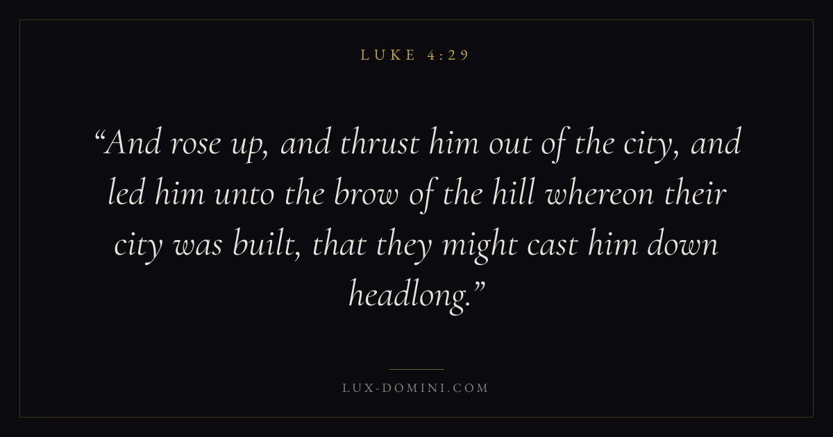 And rose up, and thrust him out of the city, and led him unto the brow of the hill whereon their city was built, that they might cast him down headlong.