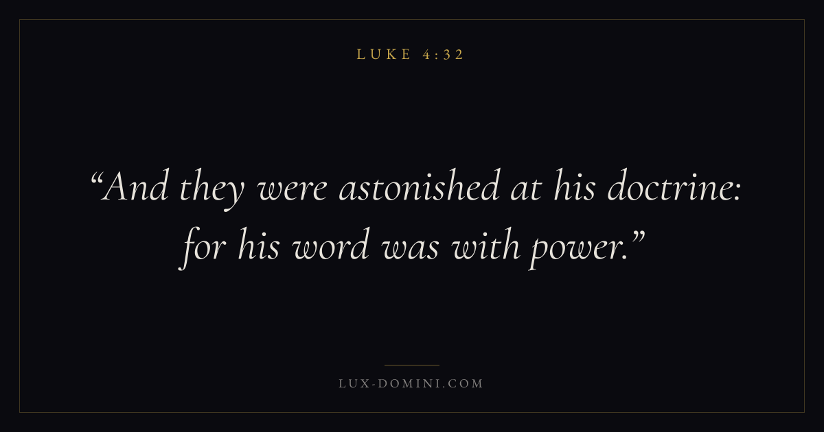 Books / Luke / Chapter 4 / Verse 32 ← Luke 4:31 Luke 4:32 Luke 4:33 → And they were astonished at his doctrine: for his word was with power. Download verse card Share on Twitter Share on Facebook Pin it ✦ Key themes PrayerJustice and mercySalvationTruthSpirit Read with Luke 4:31Matthew 6:9Luke 18:1Micah 6:8 Related topics Bible verses about prayerBible verses about justice and mercyBible verses about salvationBible verses about truth ✦ Luke Chapter 4 verses V. 1 V. 2 V. 3 V. 4 V. 5 V. 6 V. 7 V. 8 V. 9 V. 10 V. 11 V. 12 V. 13 V. 14 V. 15 V. 16 V. 17 V. 18 V. 19 V. 20 V. 21 V. 22 V. 23 V. 24 V. 25 V. 26 V. 27 V. 28 V. 29 V. 30 V. 31 V. 32 V. 33 V. 34 V. 35 V. 36 V. 37 V. 38 V. 39 V. 40 V. 41 V. 42 V. 43 V. 44
