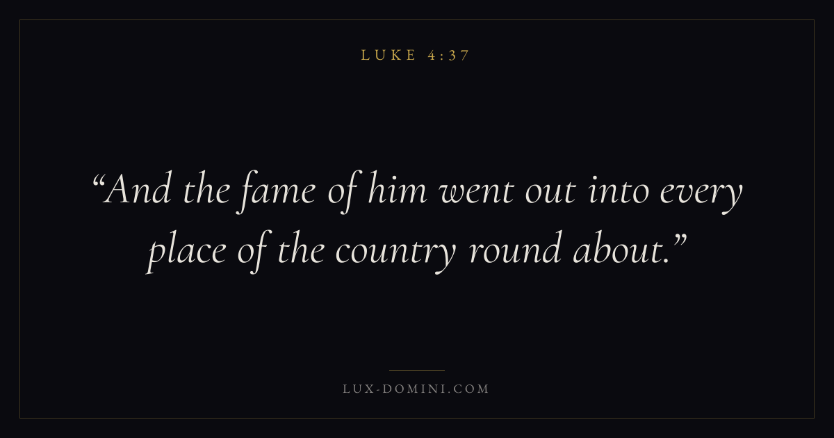 Books / Luke / Chapter 4 / Verse 37 ← Luke 4:36 Luke 4:37 Luke 4:38 → And the fame of him went out into every place of the country round about. Download verse card Share on Twitter Share on Facebook Pin it ✦ Key themes PrayerJustice and mercySalvationSpirit Read with Luke 4:33Luke 4:34Matthew 6:9Luke 18:1 Related topics Bible verses about prayerBible verses about justice and mercyBible verses about salvation ✦ Luke Chapter 4 verses V. 1 V. 2 V. 3 V. 4 V. 5 V. 6 V. 7 V. 8 V. 9 V. 10 V. 11 V. 12 V. 13 V. 14 V. 15 V. 16 V. 17 V. 18 V. 19 V. 20 V. 21 V. 22 V. 23 V. 24 V. 25 V. 26 V. 27 V. 28 V. 29 V. 30 V. 31 V. 32 V. 33 V. 34 V. 35 V. 36 V. 37 V. 38 V. 39 V. 40 V. 41 V. 42 V. 43 V. 44