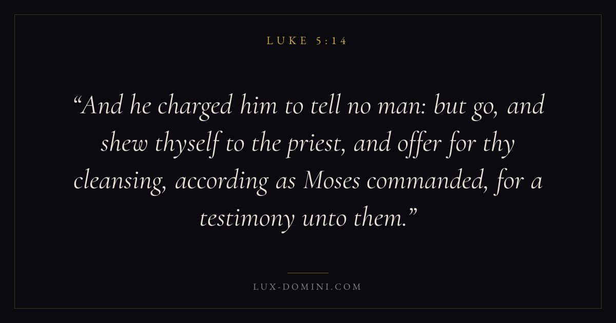 And he charged him to tell no man: but go, and shew thyself to the priest, and offer for thy cleansing, according as Moses commanded, for a testimony unto them.
