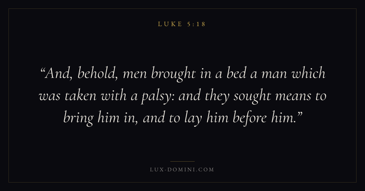 And, behold, men brought in a bed a man which was taken with a palsy: and they sought means to bring him in, and to lay him before him.