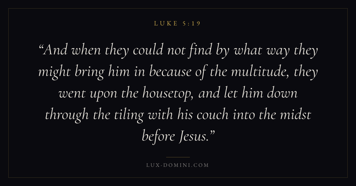 And when they could not find by what way they might bring him in because of the multitude, they went upon the housetop, and let him down through the tiling with his couch into the midst before Jesus.