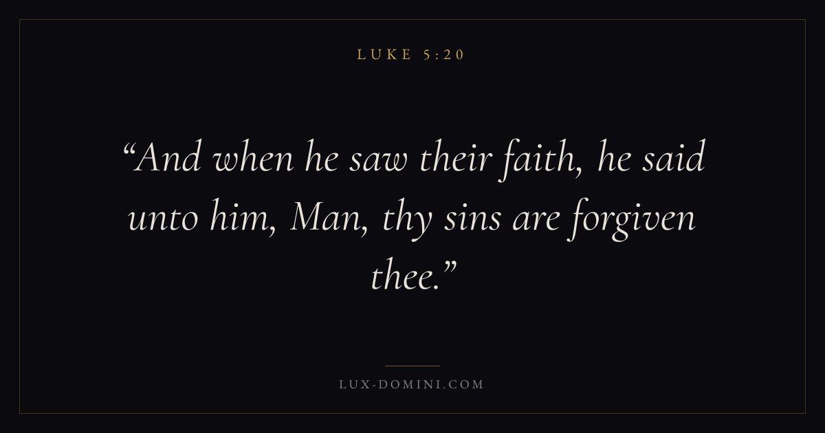 Books / Luke / Chapter 5 / Verse 20 ← Luke 5:19 Luke 5:20 Luke 5:21 → And when he saw their faith, he said unto him, Man, thy sins are forgiven thee. Download verse card Share on Twitter Share on Facebook Pin it ✦ Key themes FaithPrayerJustice and mercyForgivenessSalvation Read with Luke 5:18Luke 5:19Hebrews 11:1Romans 10:17 Related topics Bible verses about faithBible verses about prayerBible verses about justice and mercyBible verses about forgivenessBible verses about salvation ✦ Luke Chapter 5 verses V. 1 V. 2 V. 3 V. 4 V. 5 V. 6 V. 7 V. 8 V. 9 V. 10 V. 11 V. 12 V. 13 V. 14 V. 15 V. 16 V. 17 V. 18 V. 19 V. 20 V. 21 V. 22 V. 23 V. 24 V. 25 V. 26 V. 27 V. 28 V. 29 V. 30 V. 31 V. 32 V. 33 V. 34 V. 35 V. 36 V. 37 V. 38 V. 39