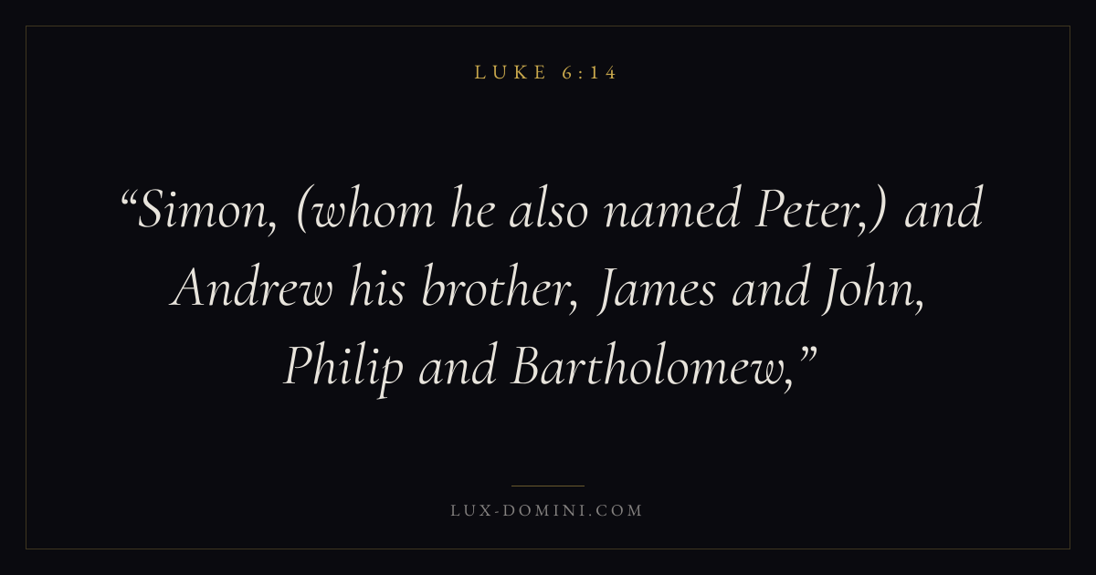 Simon, (whom he also named Peter,) and Andrew his brother, James and John, Philip and Bartholomew,