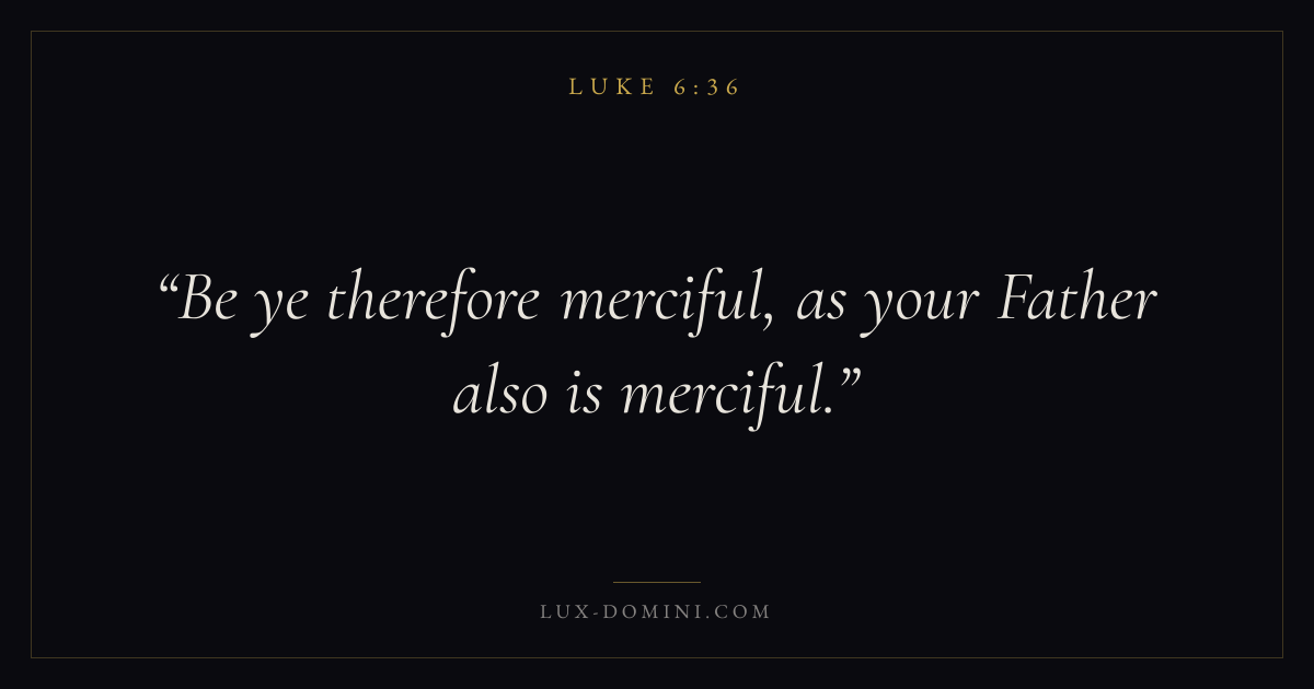 Books / Luke / Chapter 6 / Verse 36 ← Luke 6:35 Luke 6:36 Luke 6:37 → Be ye therefore merciful, as your Father also is merciful. Download verse card Share on Twitter Share on Facebook Pin it ✦ Key themes LoveFaithPrayerJustice and mercySalvation Read with Luke 6:35John 3:161 Corinthians 13:4Hebrews 11:1 Related topics Bible verses about loveBible verses about faithBible verses about prayerBible verses about justice and mercyBible verses about salvation ✦ Luke Chapter 6 verses V. 1 V. 2 V. 3 V. 4 V. 5 V. 6 V. 7 V. 8 V. 9 V. 10 V. 11 V. 12 V. 13 V. 14 V. 15 V. 16 V. 17 V. 18 V. 19 V. 20 V. 21 V. 22 V. 23 V. 24 V. 25 V. 26 V. 27 V. 28 V. 29 V. 30 V. 31 V. 32 V. 33 V. 34 V. 35 V. 36 V. 37 V. 38 V. 39 V. 40 V. 41 V. 42 V. 43 V. 44 V. 45 V. 46 V. 47 V. 48 V. 49