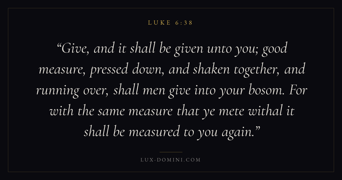 Give, and it shall be given unto you; good measure, pressed down, and shaken together, and running over, shall men give into your bosom. For with the same measure that ye mete withal it shall be measured to you again.