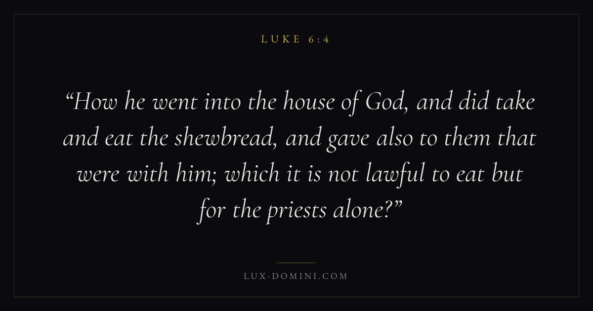 How he went into the house of God, and did take and eat the shewbread, and gave also to them that were with him; which it is not lawful to eat but for the priests alone?