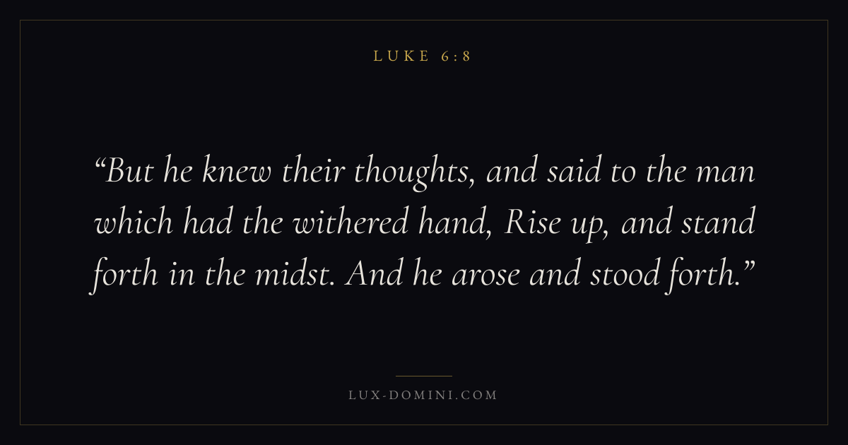 But he knew their thoughts, and said to the man which had the withered hand, Rise up, and stand forth in the midst. And he arose and stood forth.