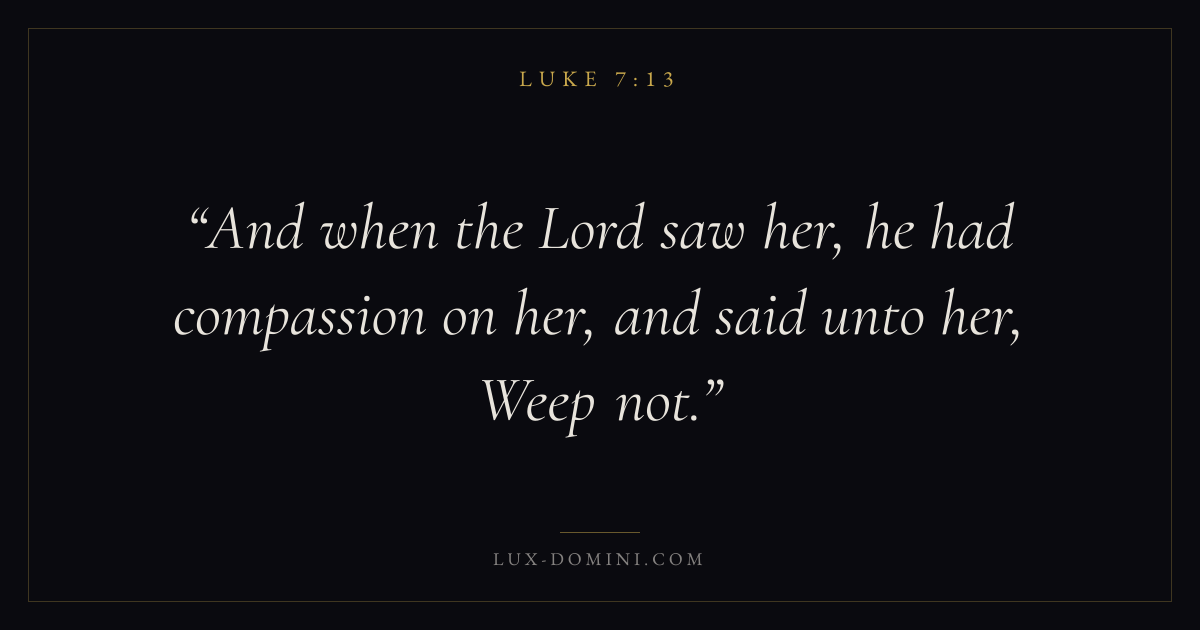 Books / Luke / Chapter 7 / Verse 13 ← Luke 7:12 Luke 7:13 Luke 7:14 → And when the Lord saw her, he had compassion on her, and said unto her, Weep not. Download verse card Share on Twitter Share on Facebook Pin it ✦ Key themes PrayerJustice and mercySalvationSpirit Read with Luke 7:11Luke 7:12Matthew 6:9Luke 18:1 Related topics Bible verses about prayerBible verses about justice and mercyBible verses about salvation ✦ Luke Chapter 7 verses V. 1 V. 2 V. 3 V. 4 V. 5 V. 6 V. 7 V. 8 V. 9 V. 10 V. 11 V. 12 V. 13 V. 14 V. 15 V. 16 V. 17 V. 18 V. 19 V. 20 V. 21 V. 22 V. 23 V. 24 V. 25 V. 26 V. 27 V. 28 V. 29 V. 30 V. 31 V. 32 V. 33 V. 34 V. 35 V. 36 V. 37 V. 38 V. 39 V. 40 V. 41 V. 42 V. 43 V. 44 V. 45 V. 46 V. 47 V. 48 V. 49 V. 50