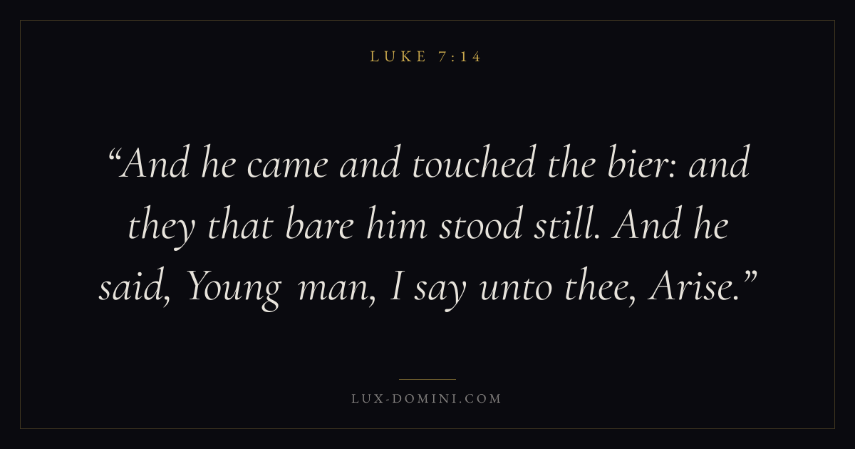 And he came and touched the bier: and they that bare him stood still. And he said, Young man, I say unto thee, Arise.