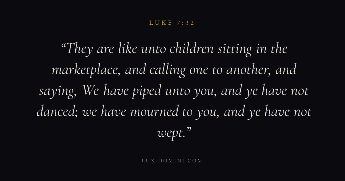 They are like unto children sitting in the marketplace, and calling one to another, and saying, We have piped unto you, and ye have not danced; we have mourned to you, and ye have not wept.