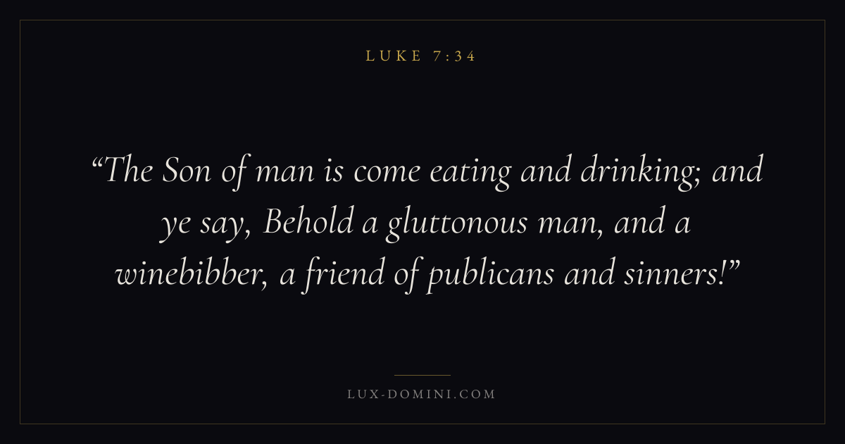 The Son of man is come eating and drinking; and ye say, Behold a gluttonous man, and a winebibber, a friend of publicans and sinners!