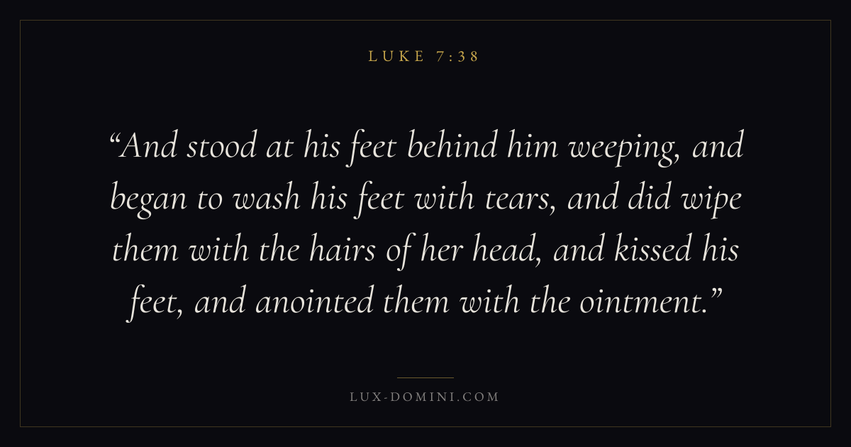 And stood at his feet behind him weeping, and began to wash his feet with tears, and did wipe them with the hairs of her head, and kissed his feet, and anointed them with the ointment.