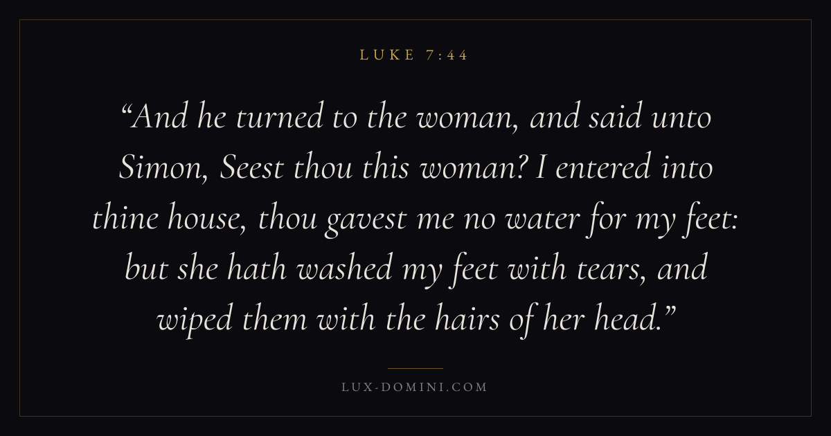 And he turned to the woman, and said unto Simon, Seest thou this woman? I entered into thine house, thou gavest me no water for my feet: but she hath washed my feet with tears, and wiped them with the hairs of her head.