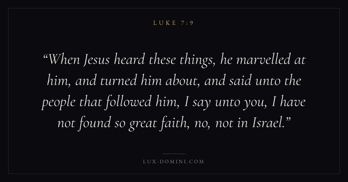 When Jesus heard these things, he marvelled at him, and turned him about, and said unto the people that followed him, I say unto you, I have not found so great faith, no, not in Israel.