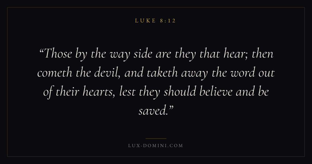 Those by the way side are they that hear; then cometh the devil, and taketh away the word out of their hearts, lest they should believe and be saved.