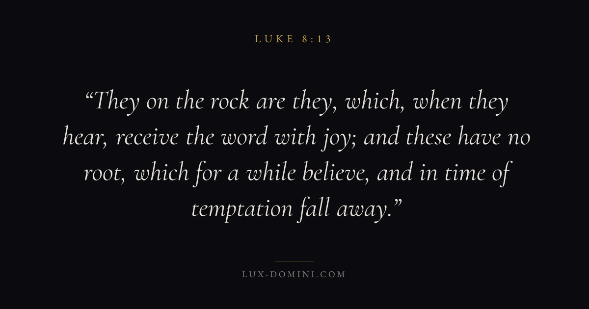 They on the rock are they, which, when they hear, receive the word with joy; and these have no root, which for a while believe, and in time of temptation fall away.