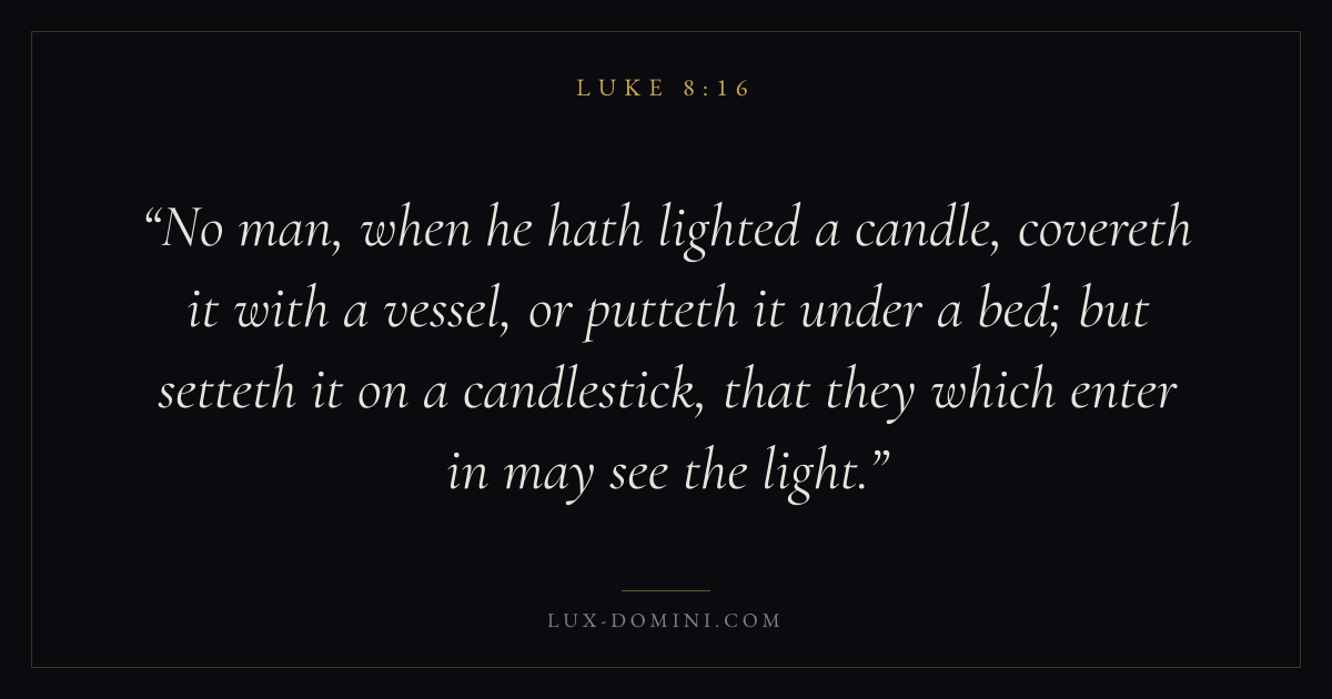 No man, when he hath lighted a candle, covereth it with a vessel, or putteth it under a bed; but setteth it on a candlestick, that they which enter in may see the light.