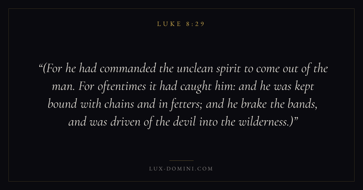 (For he had commanded the unclean spirit to come out of the man. For oftentimes it had caught him: and he was kept bound with chains and in fetters; and he brake the bands, and was driven of the devil into the wilderness.)