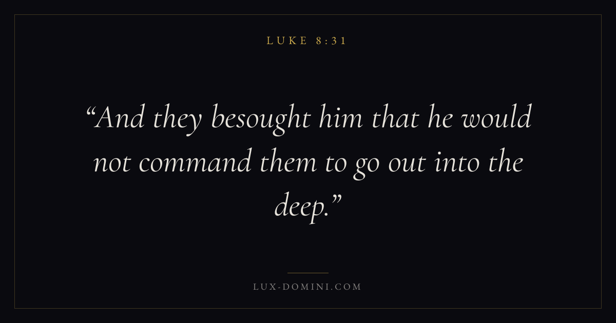 Books / Luke / Chapter 8 / Verse 31 ← Luke 8:30 Luke 8:31 Luke 8:32 → And they besought him that he would not command them to go out into the deep. Download verse card Share on Twitter Share on Facebook Pin it ✦ Key themes Anxiety and fearPrayerJustice and mercySalvationSpirit Read with Luke 8:29Luke 8:30Philippians 4:6Isaiah 41:10 Related topics Bible verses about anxiety and fearBible verses about prayerBible verses about justice and mercyBible verses about salvation ✦ Luke Chapter 8 verses V. 1 V. 2 V. 3 V. 4 V. 5 V. 6 V. 7 V. 8 V. 9 V. 10 V. 11 V. 12 V. 13 V. 14 V. 15 V. 16 V. 17 V. 18 V. 19 V. 20 V. 21 V. 22 V. 23 V. 24 V. 25 V. 26 V. 27 V. 28 V. 29 V. 30 V. 31 V. 32 V. 33 V. 34 V. 35 V. 36 V. 37 V. 38 V. 39 V. 40 V. 41 V. 42 V. 43 V. 44 V. 45 V. 46 V. 47 V. 48 V. 49 V. 50 V. 51 V. 52 V. 53 V. 54 V. 55 V. 56