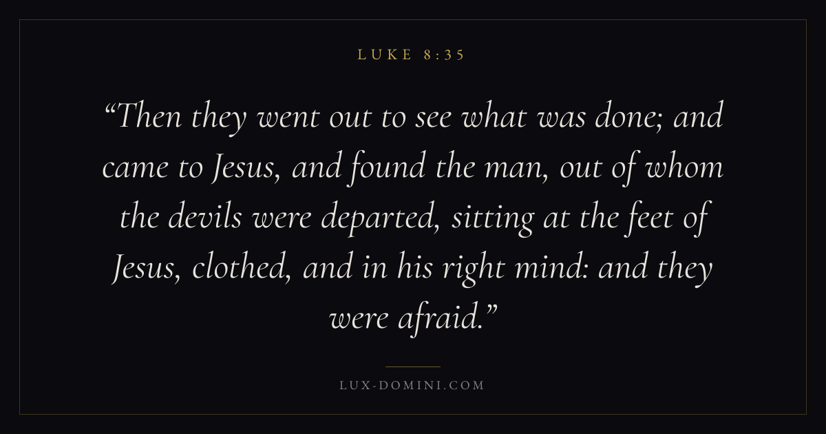 Then they went out to see what was done; and came to Jesus, and found the man, out of whom the devils were departed, sitting at the feet of Jesus, clothed, and in his right mind: and they were afraid.
