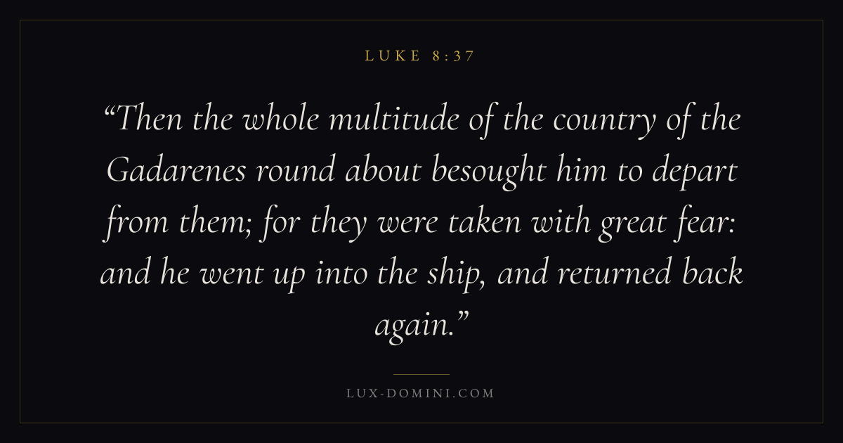 Then the whole multitude of the country of the Gadarenes round about besought him to depart from them; for they were taken with great fear: and he went up into the ship, and returned back again.