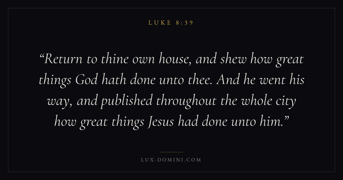 Return to thine own house, and shew how great things God hath done unto thee. And he went his way, and published throughout the whole city how great things Jesus had done unto him.
