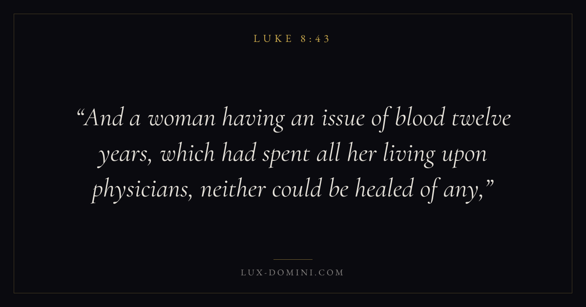 And a woman having an issue of blood twelve years, which had spent all her living upon physicians, neither could be healed of any,