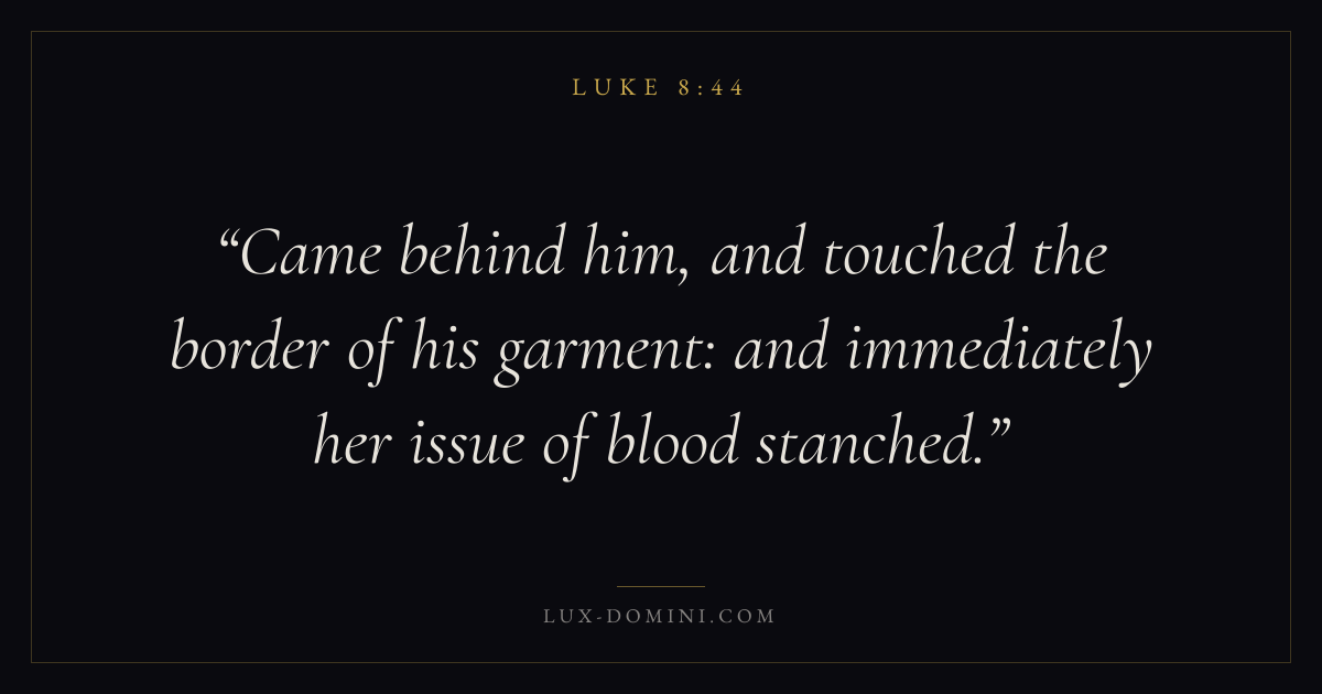 Came behind him, and touched the border of his garment: and immediately her issue of blood stanched.