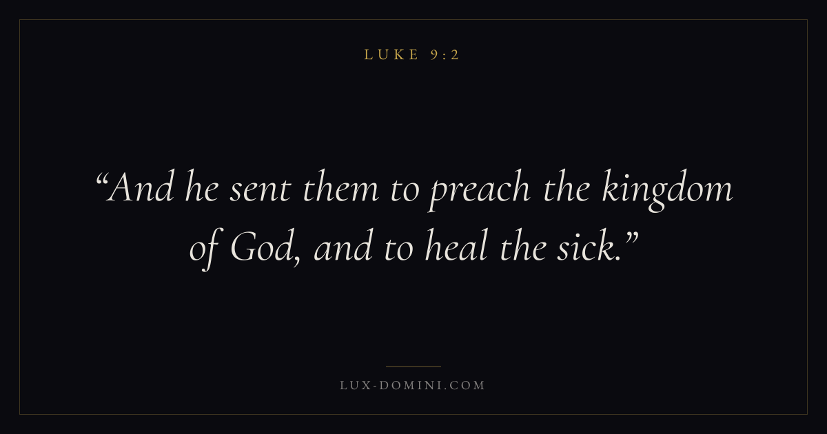 Books / Luke / Chapter 9 / Verse 2 ← Luke 9:1 Luke 9:2 Luke 9:3 → And he sent them to preach the kingdom of God, and to heal the sick. Download verse card Share on Twitter Share on Facebook Pin it ✦ Key themes Anxiety and fearPrayerJustice and mercySalvationSpirit Read with Luke 9:1Luke 9:3Philippians 4:6Isaiah 41:10 Related topics Bible verses about anxiety and fearBible verses about prayerBible verses about justice and mercyBible verses about salvation ✦ Luke Chapter 9 verses V. 1 V. 2 V. 3 V. 4 V. 5 V. 6 V. 7 V. 8 V. 9 V. 10 V. 11 V. 12 V. 13 V. 14 V. 15 V. 16 V. 17 V. 18 V. 19 V. 20 V. 21 V. 22 V. 23 V. 24 V. 25 V. 26 V. 27 V. 28 V. 29 V. 30 V. 31 V. 32 V. 33 V. 34 V. 35 V. 36 V. 37 V. 38 V. 39 V. 40 V. 41 V. 42 V. 43 V. 44 V. 45 V. 46 V. 47 V. 48 V. 49 V. 50 V. 51 V. 52 V. 53 V. 54 V. 55 V. 56 V. 57 V. 58 V. 59 V. 60 V. 61 V. 62
