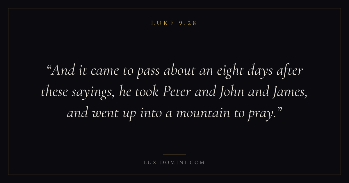 And it came to pass about an eight days after these sayings, he took Peter and John and James, and went up into a mountain to pray.